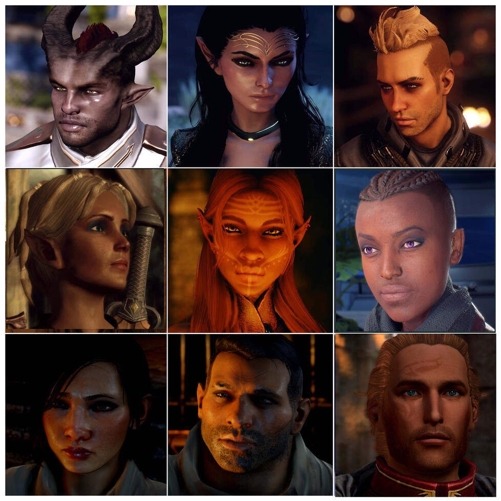 -Below, you'll find a collage of my own OCs that I've done.From left to right, top to bottom:Red Bear - The sweet cinnamon roll with a heart of gold and a healer's touch. Spirit Healer, tailor, mender, and will bake and leave you your favorite treats on your pillow. Strength through kindness and never giving up on those around him.Kahlan Lavellan - Academic, unintentionally funny, fierce defender of the elven people, sufferer of intergenerational trauma and familial drama with her clan. Falls for Solas, ends very badly. She learns she needs no one but herself to achieve her dreams and finding her true purpose in life.Evandur Treveylan - Tragic, misunderstood, manipulative and broody, self-loathing blood mage that fell from grace. Multiple times. And deeper still. His story is still unfolding as I continue writing it, but Cullen and he have a tumultuous relationship with a lot of things to work out.Aeoli Tabris - My first Dragon Age character ever, created in 2008, before the game even came out. My canon girlie and some of the most memorable and fond moments and writing I've done for her. She has two worldstates, the main canon where Ali is king and he dumps her, and she dies at the end of the game (purely to spite him). Or where he isn't king, and they both remain Wardens, and continue their long adventure together.Princess Nanea Astraea Lavellan - A living Disney Princess. A storysinger that holds her clan's histories in song, and has a naive outlook on the world from living a sheltered life. A rocky path of turmoil and hardships meet her before even getting the Mark. Yet through it all, she continues to adapt. To tell her own story. A princess and knight romance with Cassandra.Nawane Ryder - Rambunctious, sparkly, reckless, coy Ryder who lived by a YOLO lifestyle and motto of helping everyone she could. Liam and Vetra romancer. A young woman with a cheeky sense of humor, steel nerves, and dirt under her nails.Amira Cadash - Spritly, inexhaustibly cheerful, curious, crafty, and sneaky. She is a former assassin (poison expert) of House Cadash that roamed Thedas under the guise of being part of a traveling circus. She wanted out of that life and Leliana gave it to her in the form of becoming an Agent for the Inquisition. (She does not have the Mark.) Known as "Florist," she gathers intel and does security operations while pretending to be a simple flower seller. Romances Blackwall.Nevan Cadash - A man with an iron stomach, heart brimming with goofy innocence, and head full of rocks. A true himbo, through and through. He's cousin to Amira, and he is the one with the Mark. Protective, ignorant, flies by the seat of his pants and hates making decisions. He falls in love with Dorian.Aelic Hawke - A dashing charmer that got through life
